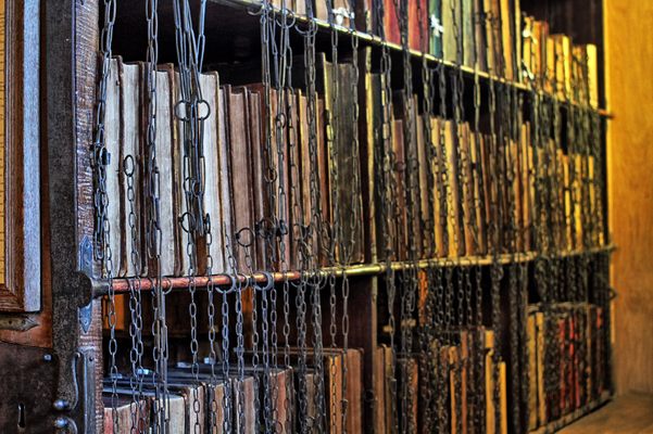 Image of chained books in Hereford Cathedral. Copyright Atlas Obscura.