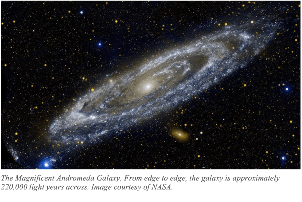 These things are also big—far bigger than we’re capable of imagining, as are the distances between them, which is why I said earlier that a telescope is a fully functional Time Machine. Andromeda, for example, is 220,000 light years across. You need a wide-angle eyepiece to look at it through a telescope. For context, consider this. The speed of light is a known constant—it never changes. Light travels at 186,000 miles per second, or just over 671 million miles per hour. Think orbiting Earth’s equator 7-1/2 times every second. That means that in one year, light travels 5.88 trillion miles. We call that a light year. It’s not a measure of time; it’s a measure of distance. To fly from one end of Andromeda to the other would take 220,000 years, at 186,000 miles per second. Pack a lunch.