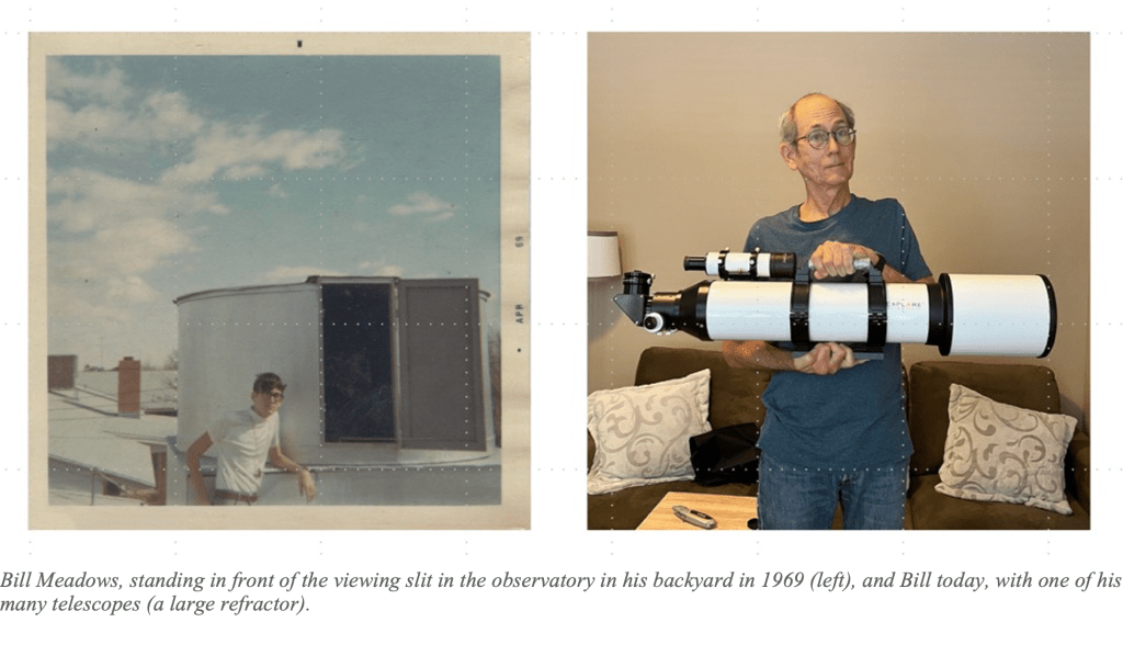 I learned two of life’s important lessons from Bill Meadows: the immensity of the universe, and the immensity of personal grief. The first, my 13-year-old shoulders were prepared to carry; the second, not so much. One Christmas morning after all the gifts had been opened, I called Bill to see if he wanted to get together, probably to compare Christmas bounty. He couldn’t, he told me; his Mom had just died. Maybe tomorrow, he said, with infinite grace. I didn’t know how to process that level of profound loss, but he did, and the grace with which he carried the pain is something I still think about today.