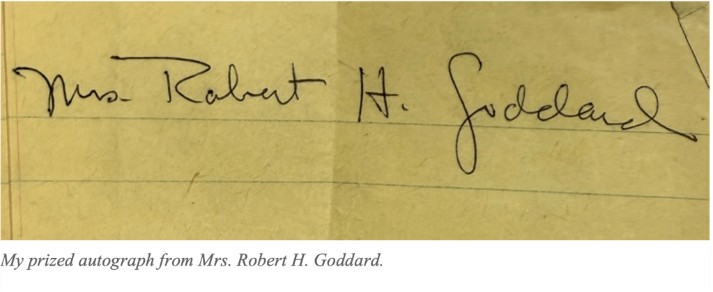 We all claimed some of the credit for building that telescope because all of us spent time hand-grinding the blank under Bill’s watchful eyes. But make no mistake: it was Bill who built that thing. He ground and ground and ground, week after week after week, starting with a coarse abrasive grit and grinding pommel, then onto a finer grit, and then finer still, until he was working with red polishing rouge at the end. I remember his pink-stained fingers at school. School: it was so fitting that we attended the brand-new Robert H. Goddard Junior High School in Midland, Texas, complete with rockets mounted on stands out front. Goddard, who invented the modern liquid-fuel rocket, was long dead, but his wife came to visit the school not long after it opened. I still have her autograph.