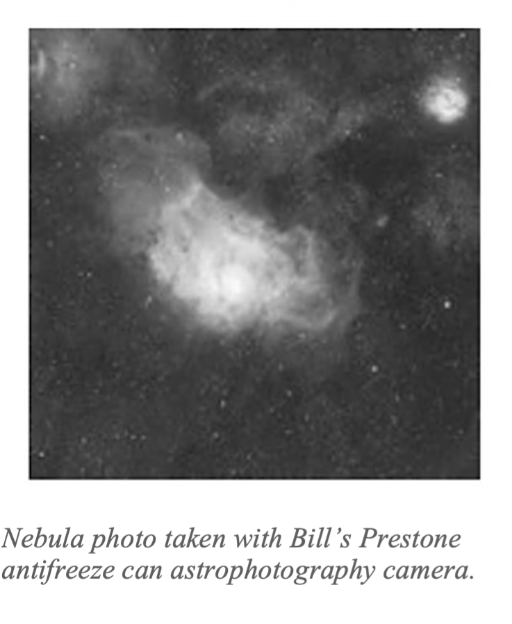 Now came the genius part. Using tin snips, he cut and bent the open top of the can so that it had two flanges, one on each side, which would neatly and securely hold a sheet film carrier plate. The plate was about five by eight inches, and once it was in the “Prestone camera” and the environment was dark, he could slide out the cover that protected the sheet film from light, and the image of whatever was in the viewfinder would be splashed on the film. Minutes later, Bill would slide the cover back in, and after sending it off to be developed, he’d have a time-lapse photograph. In fact, I still have a photograph he gave me of the Orion Nebula somewhere in my files, along with one of a long-forgotten star cluster.