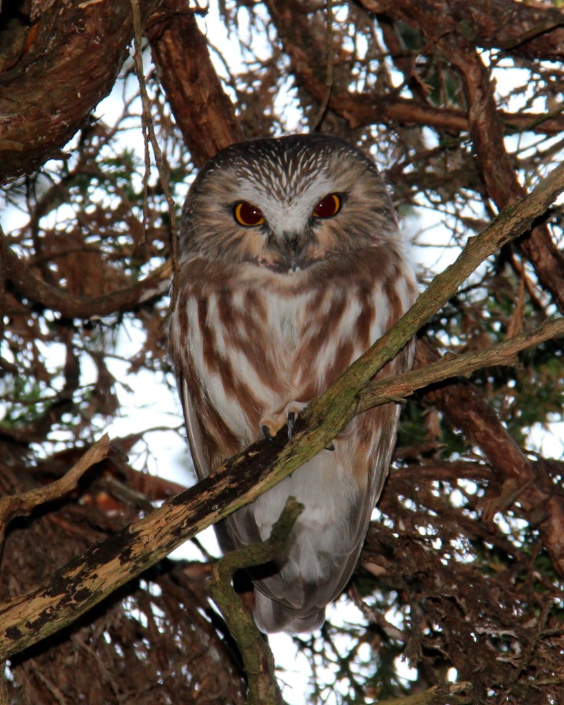 So, here’s my request to you, the listener. Consider this your homework assignment. Go outside and listen, and be deliberate about it. Go for a walk, and don’t just passively hear—really, really listen. You’ll soon become aware of how diverse the sounds are, when they happen, why they happen, who’s making them, and where. You’ll begin to understand the interactions among the animals making the sounds, and what those interactions mean. You’ll start to become a true practitioner of fieldcraft. When you see an entire flotilla of water birds suddenly lift off the lake as one, calling loudly and chaotically, you’ll automatically look straight up, because there will undoubtedly be a raptor—an eagle, an osprey, a peregrine, flying overhead, looking for a meal. You’ll see a flock of chickadees incessantly and aggressively flying in and out of a pine tree, caterwauling as only chickadees can, and you’ll know that there is almost certainly a northern saw-whet owl, the sworn enemy of the chickadee, sitting quietly on a branch of that tree.