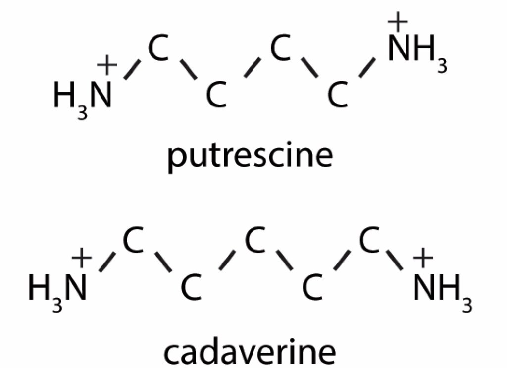The smell actually comes from two chemicals, both of which are so perfectly named that whoever named them clearly had a good time doing so. The first of them is called cadaverine; the second, putrescine. Can you think of better names for this stuff? Interestingly, putrescine is used industrially to make a form of nylon.