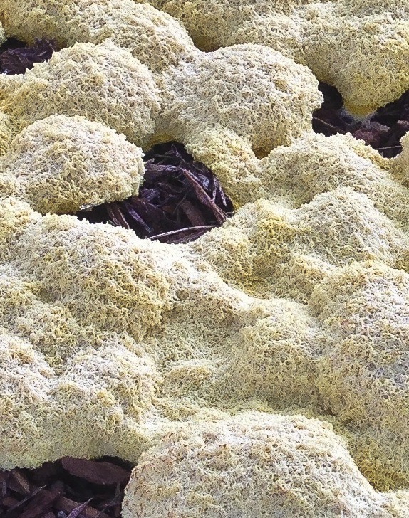 So I decided to leave it where it was. I went inside grabbed my iPad, and searched for “yellow slime on mulch.” Instantly, I was rewarded with a photograph of my slime – Fuligo septica, otherwise known as Dog Vomit Slime Mold. Scientists must have a blast naming things—that has to be a high point when they discover something new. And by the way, it’s also called scrambled egg slime and flowers of tan. In Mexico, they do, in fact, scramble them like eggs and eat them. In Spanish, they’re called caca de luna, which means … well, caca is the Spanish word for what comes out of the north end of a south-bound dog, luna means moon. So this is moon sh—well, you know. I’ve tried them in pueblos south of Mexico City, and they’re not bad—kind of nutty.