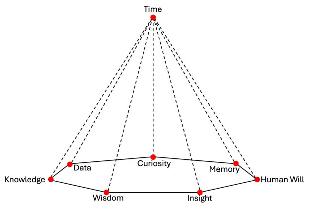 THIS BRINGS ME TO TIME, and why it sits at the apex of my seven-sided cone. Does time as we know it only exist because of recallable human memory? Does our ability to conceive of the future only exist because, thanks to accessible memory and a perception of the difference between a beginning state and an end state, of where we are vs. where we were, we perceive the difference between past and present, and a recognition that the present is the past’s future, but also the future’s past?