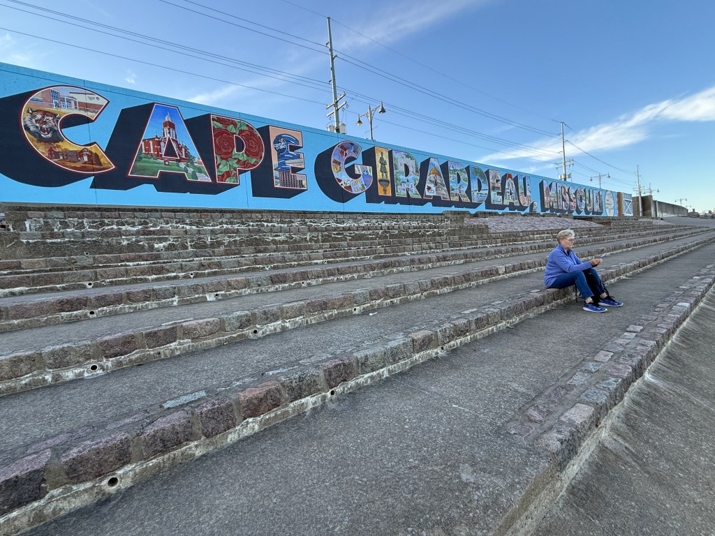 We spent the night in Cape Girardeau, Missouri, in a downtown hotel that’s just up the street from the Mississippi River. The river, of course, is unimaginably immense, and this is a comparatively narrow section of it—at Cape Girardeau’s waterfront, it’s about 900 feet across. The river’s surface is about 30 feet lower than the street, and the street—and therefore, the town—is protected by a 25-foot “seawall”—river-wall? —because several times in the recent past, the river has gone OVER the wall. Think about that: A river as massive as the Mississippi, 11 miles wide at its widest point, has risen more than 50 feet from where we were standing at its shore.