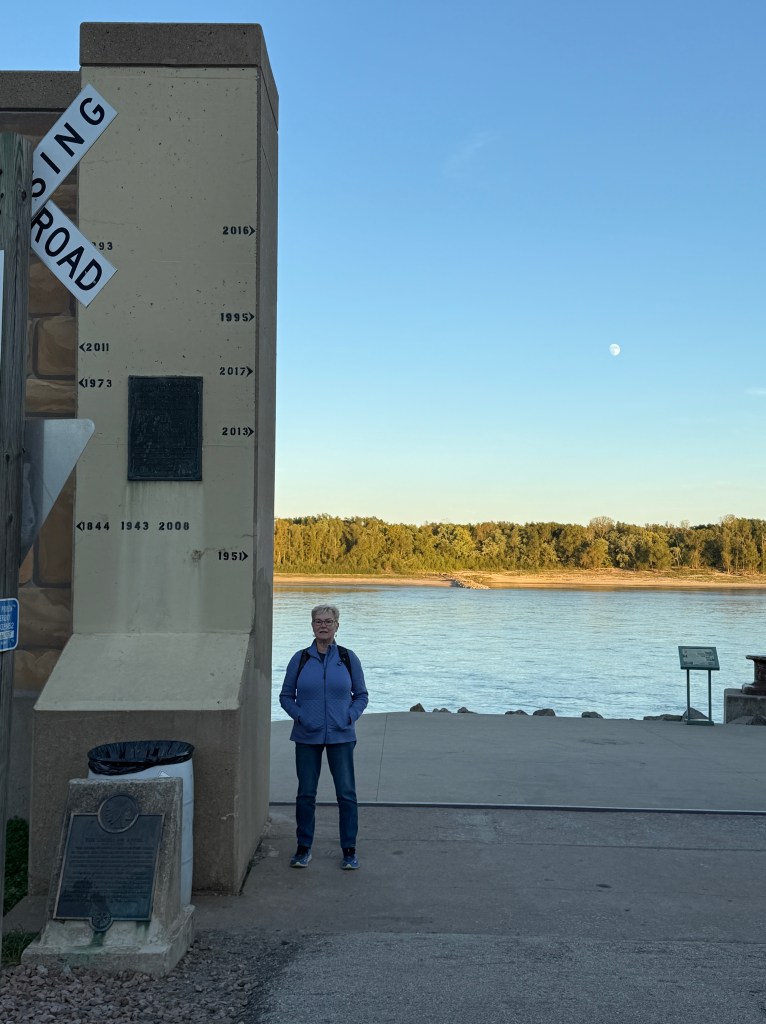 Sabine standing next to the seawall that protects Cape Girardeau. Look closely–you can see the marks showing the high water levels over the years, and the river, far below.